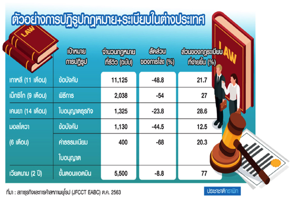 “จึงเสนอให้โละกฎหมายที่ไม่จำเป็น ไม่ทันสมัย 39% ปรับปรุงกฎหมาย 43% สร้างกฎหมายใหม่ ยุบรวมกฎหมาย 4% และให้คงไว้ 15% จากทั้งหมด 1,094 กระบวนงาน จะช่วยลดต้นทุนให้ประชาชน 1.3 แสนล้านบาท หรือ 0.8% ของจีดีพี เป็นวิธีฟื้นฟูเศรษฐกิจที่ทำได้ง่าย ไม่ต้องสูญเสียงบประมาณ”